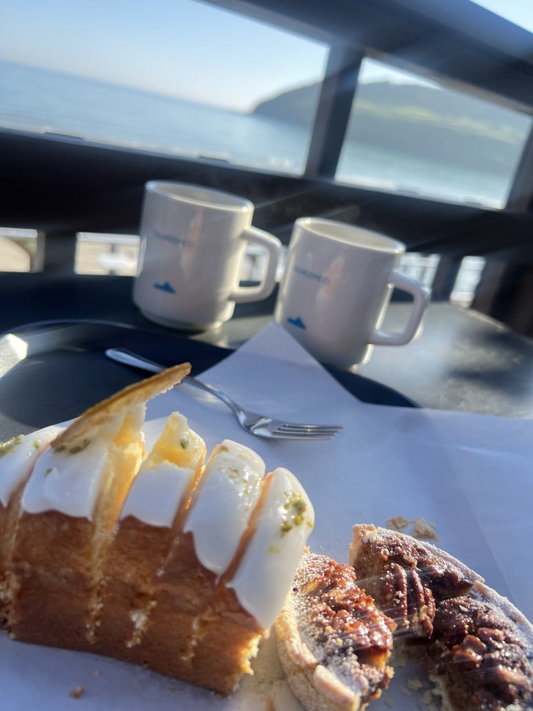 밤을 꼬박 새우다시피 하고 제주에 내리니 카페인이 무척 당기더라고요. 설마 이 시간에 문 연 카페가 있을까 하고 열심히 검색하다가 <델문도>를 발견했어요. 멋진 풍광을 자랑하는 함덕해수욕장 한가운데 위치해 있더라고요. 감동 감동! 게다가 애견 동반 카페라니.... 이곳에 도착하자마자 토리를 가방에 넣고 야외 테이블에 자리를 잡았어요. 상쾌한 아침 기운을 느끼며 커피를 주문하고 군침 도는 빵들을 몇 가지 담았어요. 향긋한 커피가 나오자마자 허겁지겁 흡입하고 맛있는 빵으로 제주의 새벽을 맞이했답니다.